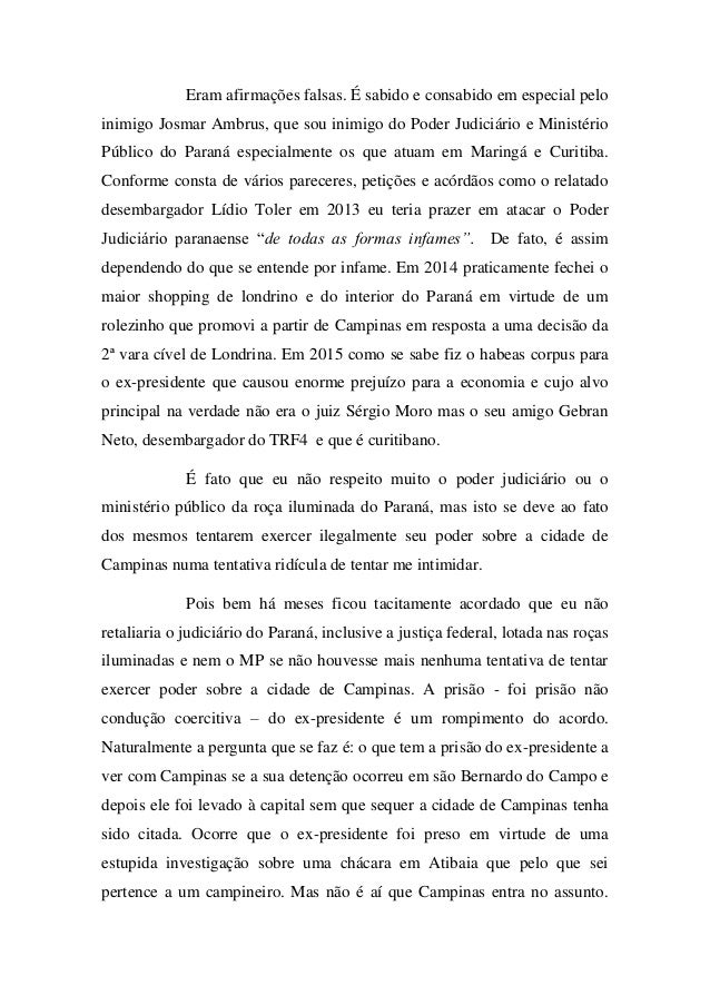 - 2. Eram afirmações falsas. É sabido e consabido em especial pelo inimigo Josmar Ambrus, que sou inimigo do Poder Judiciário e Ministério Público do Paraná especialmente os que atuam em Maringá e Curitiba. Conforme consta de vários pareceres, petições e acórdãos como o relatado desembargador Lídio Toler em 2013 eu teria prazer em atacar o Poder Judiciário paranaense “de todas as formas infames”. De fato, é assim dependendo do que se entende por infame. Em 2014 praticamente fechei o maior shopping de londrino e do interior do Paraná em virtude de um rolezinho que promovi a partir de Campinas em resposta a uma decisão da 2ª vara cível de Londrina. Em 2015 como se sabe fiz o habeas corpus para o ex-presidente que causou enorme prejuízo para a economia e cujo alvo principal na verdade não era o juiz Sérgio Moro mas o seu amigo Gebran Neto, desembargador do TRF4 e que é curitibano. É fato que eu não respeito muito o poder judiciário ou o ministério público da roça iluminada do Paraná, mas isto se deve ao fato dos mesmos tentarem exercer ilegalmente seu poder sobre a cidade de Campinas numa tentativa ridícula de tentar me intimidar. Pois bem há meses ficou tacitamente acordado que eu não retaliaria o judiciário do Paraná, inclusive a justiça federal, lotada nas roças iluminadas e nem o MP se não houvesse mais nenhuma tentativa de tentar exercer poder sobre a cidade de Campinas. A prisão - foi prisão não condução coercitiva – do ex-presidente é um rompimento do acordo. Naturalmente a pergunta que se faz é: o que tem a prisão do ex-presidente a ver com Campinas se a sua detenção ocorreu em são Bernardo do Campo e depois ele foi levado à capital sem que sequer a cidade de Campinas tenha sido citada. Ocorre que o ex-presidente foi preso em virtude de uma estupida investigação sobre uma chácara em Atibaia que pelo que sei pertence a um campineiro. Mas não é aí que Campinas entra no assunto.