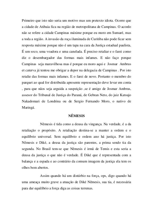 - 3. Primeiro que isto não seria um motivo mas um pretexto idiota. Ocorre que a cidade de Atibaia fica na região de metropolitana de Campinas. O acordo não se refere a cidade Campinas máxime porque eu moro em Sumaré, mas a toda a região. A invasão da roça iluminada de Curitiba não pode ficar sem resposta máxime porque não é um tapa na cara da Justiça estadual paulista, É um soco, uma voadora e uma canelada. É preciso retaliar e o farei como diz o desembargador das formas mais infames. E não faço porque Campinas seja maravilhosa mas é porque eu moro aqui e Josmar Ambrus et caterva já tentou me obrigar a depor na delegacia de Campinas . Por isto retalie das formas mais infames. E o farei de novo. Portanto o membro do parquet ao qual for distribuída apresente representação deve levar em conta , para que nãos seja arguida a suspeição ,se é amigo de Josmar Ambrus, assesor do Tribunal de Justiça do Paraná, de Gebran Neto, do juiz Katsujo Nakadomari de Londrina ou de Sergio Fernando Moro, o nativo de Maringá. NÊMESIS Nêmesis é tida como a deusa da vingança. Na verdade, é a da retaliação o propósito. A retaliação destina-se a manter a ordem e o equilíbrio universal. Sem equilíbrio e ordem ano há justiça. Por isto Nêmesis e Diké, a deusa da justiça são parentes, a prima sendo tia da segunda. No Brasil tem-se que Nêmesis é irmã de Temis e esta seria a deusa da justiça o que não é verdade. É Diké que é representada com a balança e a espada e ao contrário da comum imagem da justiça ela tem os olhos bem abertos. Assim quando há um distúrbio na força, ops, digo quando há uma ameaça muito grave a atuação de Diké Nêmesis, sua tia, é necessária para dar equilíbrio a força diga as coisas terrenas.