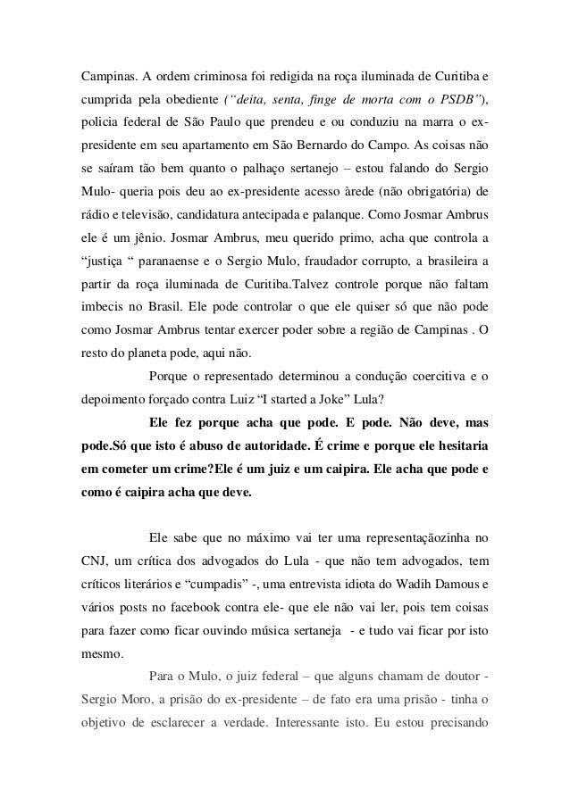 - 5. Campinas. A ordem criminosa foi redigida na roça iluminada de Curitiba e cumprida pela obediente (“deita, senta, finge de morta com o PSDB”), policia federal de São Paulo que prendeu e ou conduziu na marra o ex- presidente em seu apartamento em São Bernardo do Campo. As coisas não se saíram tão bem quanto o palhaço sertanejo – estou falando do Sergio Mulo- queria pois deu ao ex-presidente acesso àrede (não obrigatória) de rádio e televisão, candidatura antecipada e palanque. Como Josmar Ambrus ele é um jênio. Josmar Ambrus, meu querido primo, acha que controla a “justiça “ paranaense e o Sergio Mulo, fraudador corrupto, a brasileira a partir da roça iluminada de Curitiba.Talvez controle porque não faltam imbecis no Brasil. Ele pode controlar o que ele quiser só que não pode como Josmar Ambrus tentar exercer poder sobre a região de Campinas . O resto do planeta pode, aqui não. Porque o representado determinou a condução coercitiva e o depoimento forçado contra Luiz “I started a Joke” Lula? Ele fez porque acha que pode. E pode. Não deve, mas pode.Só que isto é abuso de autoridade. É crime e porque ele hesitaria em cometer um crime?Ele é um juiz e um caipira. Ele acha que pode e como é caipira acha que deve. Ele sabe que no máximo vai ter uma representaçãozinha no CNJ, um crítica dos advogados do Lula - que não tem advogados, tem críticos literários e “cumpadis” -, uma entrevista idiota do Wadih Damous e vários posts no facebook contra ele- que ele não vai ler, pois tem coisas para fazer como ficar ouvindo música sertaneja - e tudo vai ficar por isto mesmo. Para o Mulo, o juiz federal – que alguns chamam de doutor - Sergio Moro, a prisão do ex-presidente – de fato era uma prisão - tinha o objetivo de esclarecer a verdade. Interessante isto. Eu estou precisando