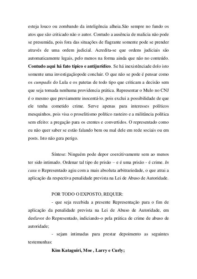 - 8. esteja louco ou zombando da inteligência alheia.São sempre no fundo os atos que são criticado não o autor. Contudo a ausência de malicia não pode se presumida, pois fora das situações de flagrante somente pode se prender através de uma ordem judicial. Acredita-se que ordens judiciais são automaticamente legais, pelo menos na forma ainda que não no conteúdo. Contudo aqui há fato típico e antijurídico. Se há inexistênciade dolo isto somente uma investigaçãopode concluir. O que não se pode é pensar como os cumpadis do Lula e os patetas de todo tipo que criticam a decisão sem que seja tomada nenhuma providencia prática. Representar o Mulo no CNJ é o mesmo que previamente inocentá-lo, pois exclui a possibilidade de que ele tenha cometido crime. Serve apenas para interesses políticos mesquinhos, pois visa o proselitismo político rasteiro e a militância política sem efeito: a pregação para os crentes e convertidos. O representado como eu não quer saber se estão falando bem ou mal dele em rede sociais ou em posts. Isto não gera perigo. Síntese: Ninguém pode depor coercitivamente sem ao menos ter sido intimado. Ordenar tal tipo de prisão – e é uma prisão - é crime. In casu o Representado agiu com a mais absoluta arbitrariedade, o que atrai a aplicação da respectiva penalidade prevista na Lei de Abuso de Autoridade. POR TODO O EXPOSTO, REQUER: - que seja recebida a presente Representação para o fim de aplicação da penalidade prevista na Lei de Abuso de Autoridade, em desfavor do Representado, indiciando-o pela prática de crime de abuso de autoridade; - sejam intimadas para prestar depoimento as seguintes testemunhas: Kim Kataguiri, Moe , Larry e Curly;